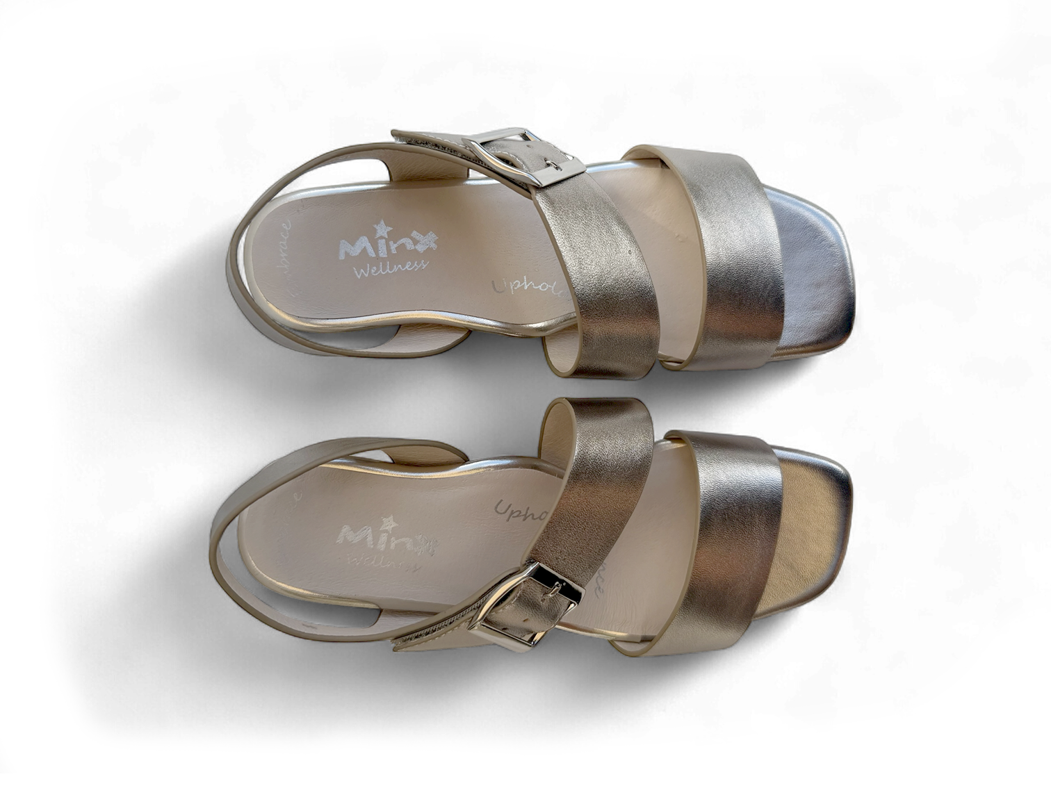 It’s a 'VIBE' and the newest addition to the Minx Summer Wellness Collection. The leather upper features chic strap sweeps across the foot, wrapping diagonally and around the heel, then fastening with a clever hidden velcro closure finished with a buckle detail. Effortless to slip on and beautifully secure, Vibe is set on a supportive heel with Minx's signature wellness comfort. Perfect for every summer event, this heel gives you a polished and feminine look with that all day feel good factor under your feet. Available at Stepping Out in Platinum or Black leather. A staff favourite!