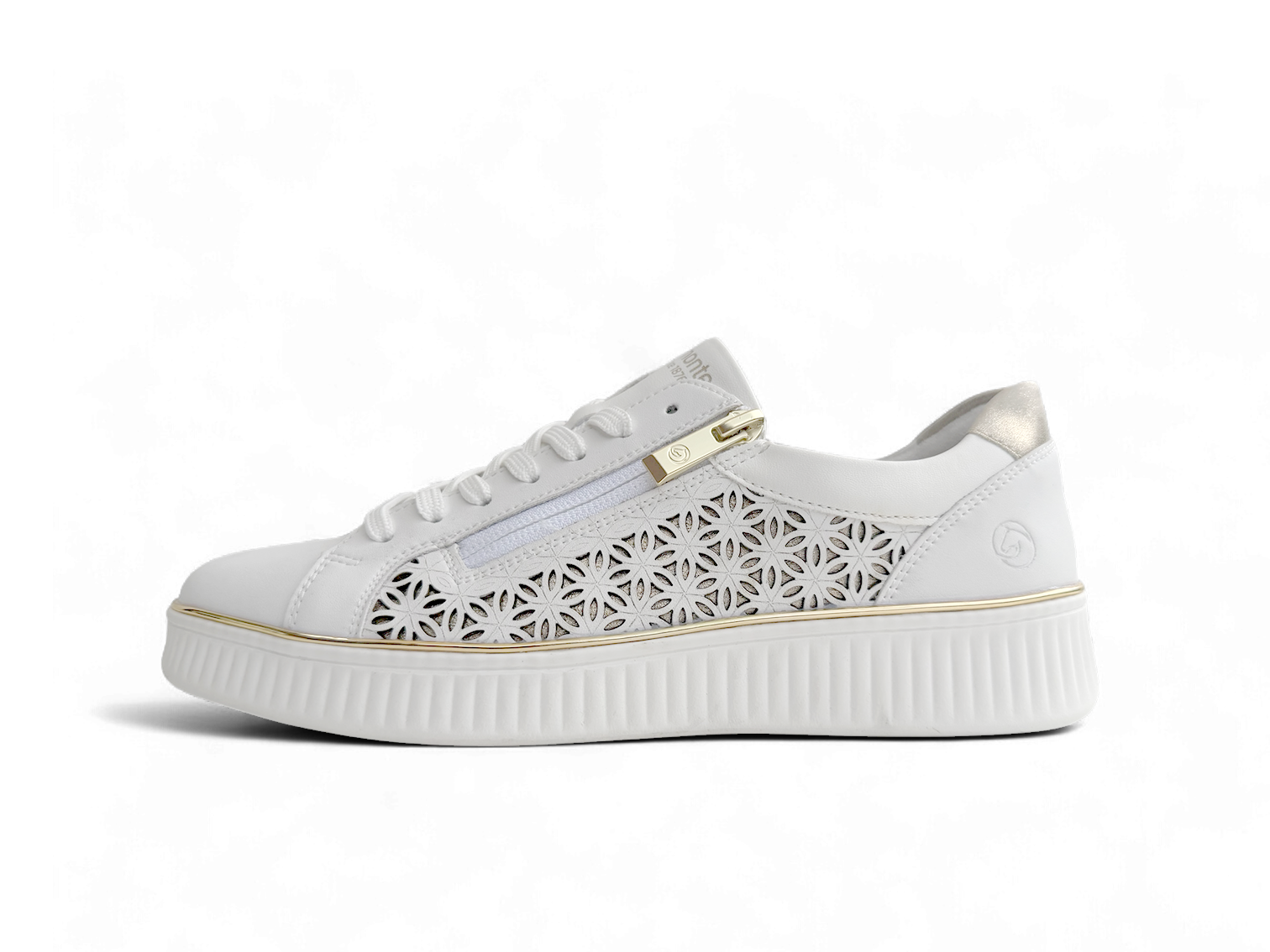 Remonte Dara is a white low-top sneakers made of smooth leather with a light and breathable microvelour lining.  The combination of lacing and zipper guarantees a perfect fit and optimal support.  With the proven remonte Lite 'n Soft technology and the padded and removable insole, the sneakers are feather-light and comfortable to wear.